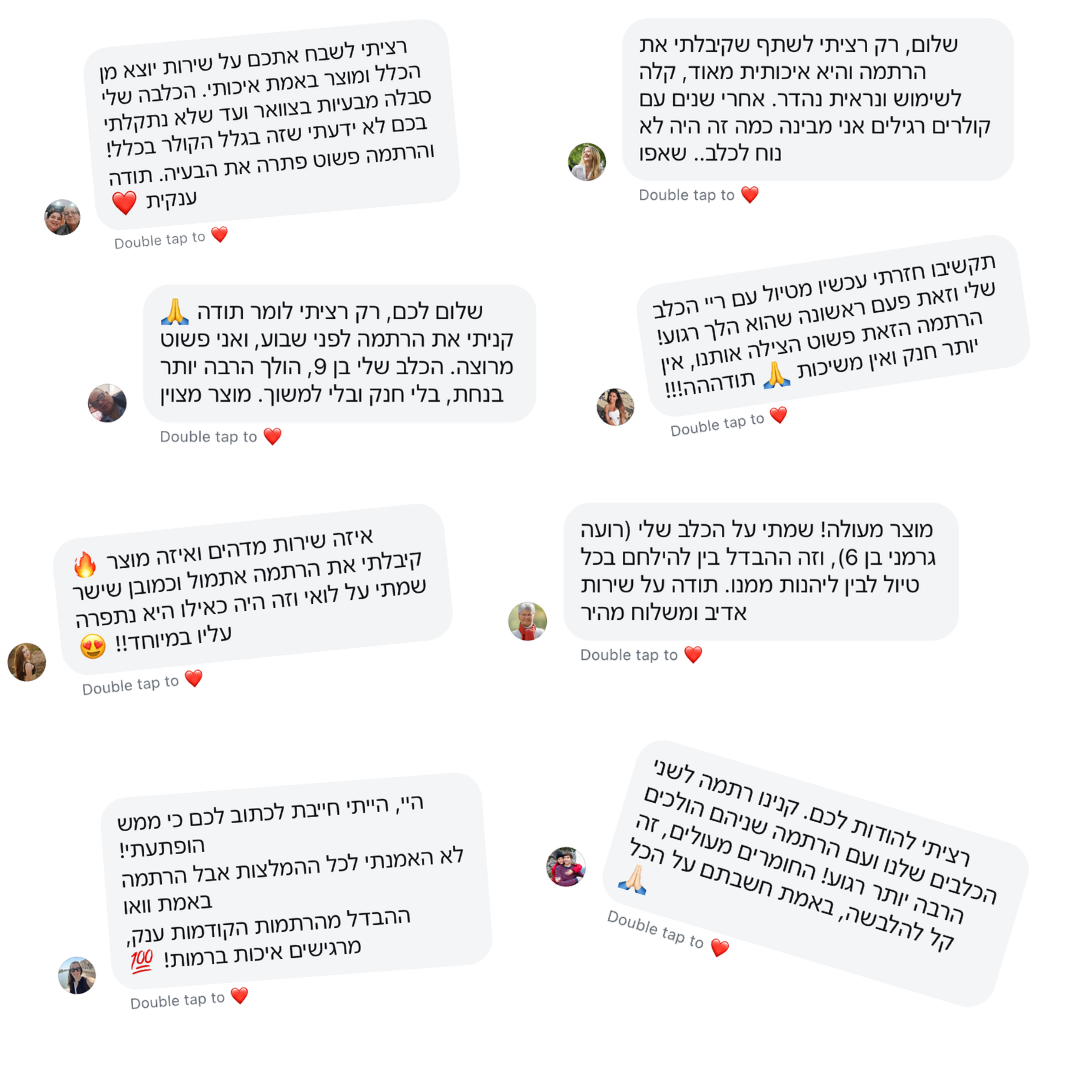 הרצועות הרכות וההתאמה האישית הופכות את הרתמה לחוויה חיובית בעיני הכלב-